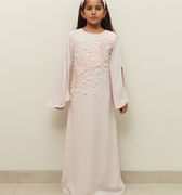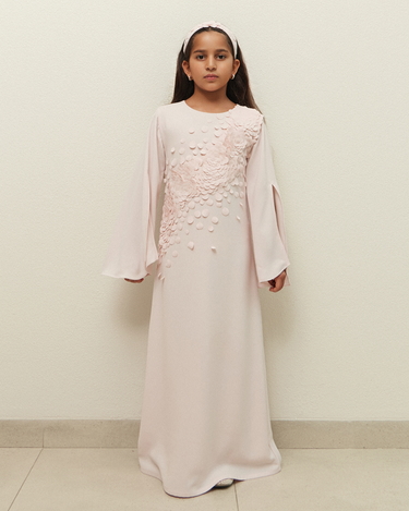 Blush Pink Off-Shoulder Gown With Flared Slit Sleeves, Featuring Floral Appliqué And Textured Dot Embellishments Across The Bodice