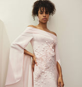Blush Pink Off-Shoulder Gown With Flared Slit Sleeves, Featuring Floral Appliqué And Textured Dot Embellishments Across The Bodice