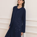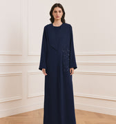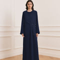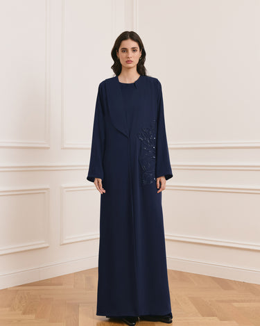 The Saphira Abaya in deep navy exudes graceful sophistication. Intricate cord detailing cinches the waist, creating a flattering silhouette, while subtle, tone-on tone embroidery adds refined texture and elegance. With its harmonious blend of structure and softness, Saphira reflects understated luxury and modern timelessness