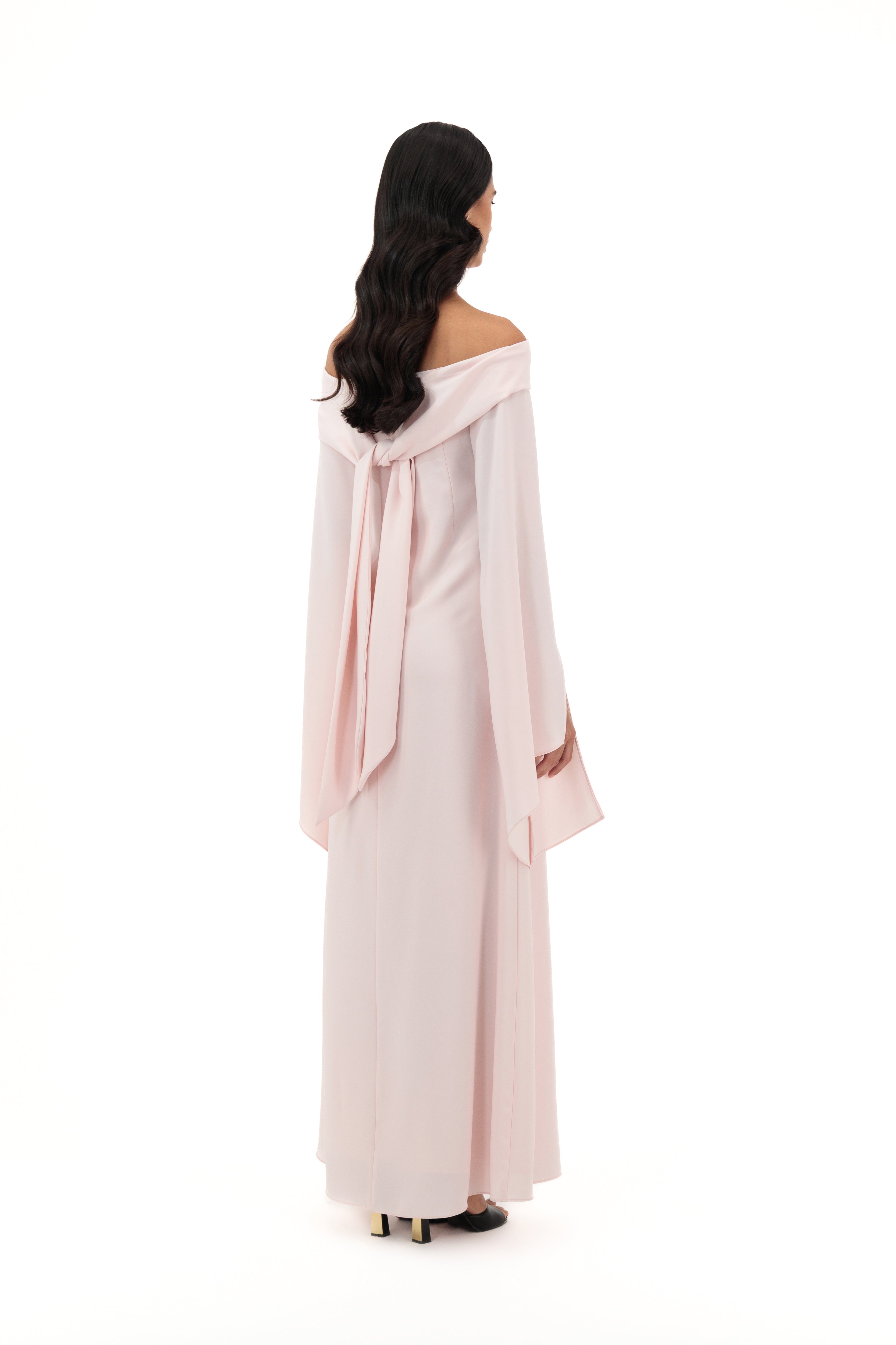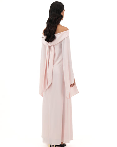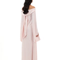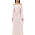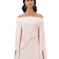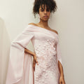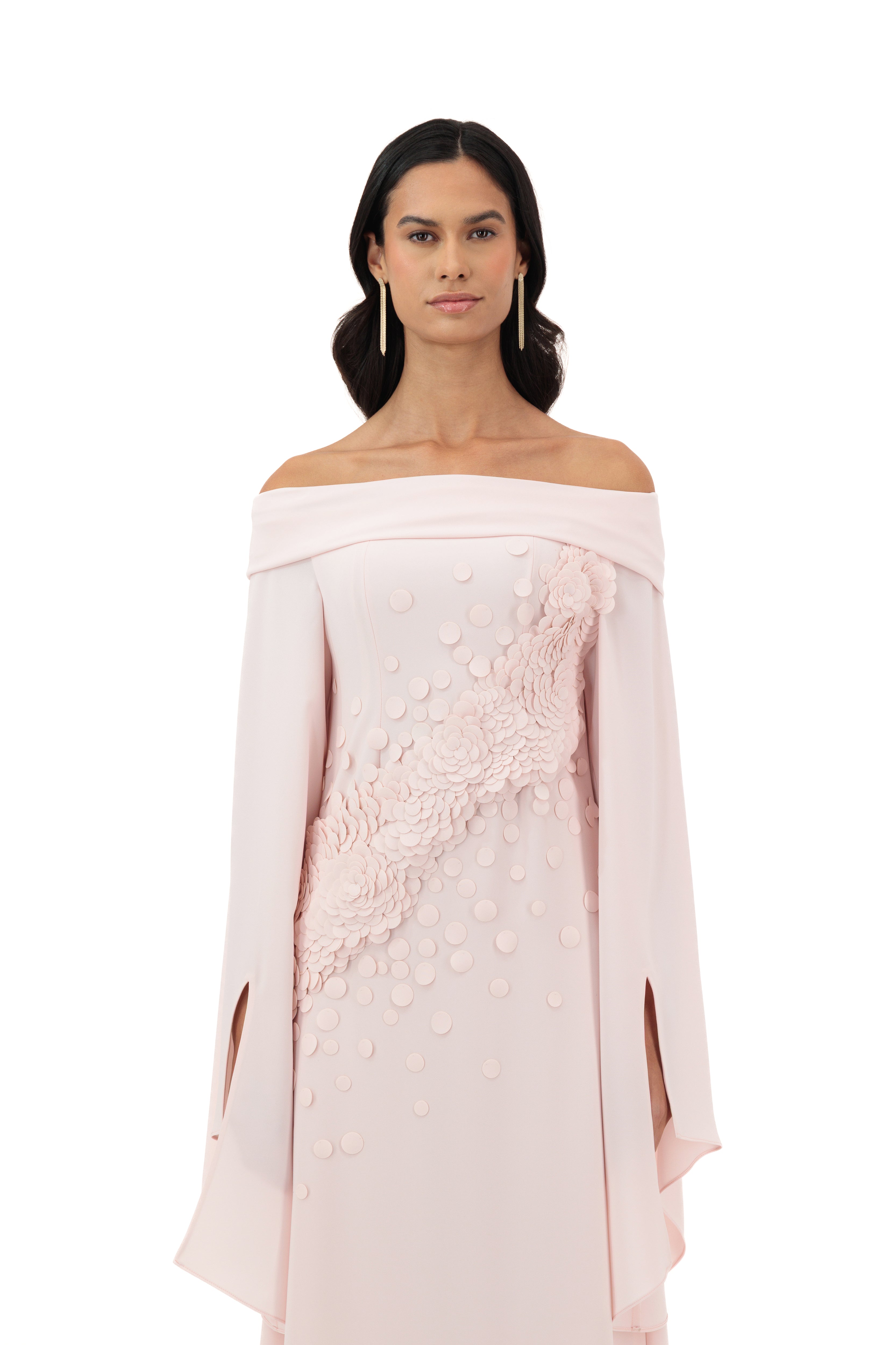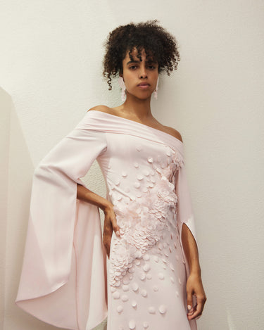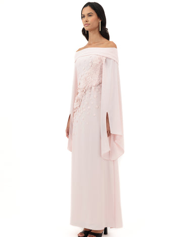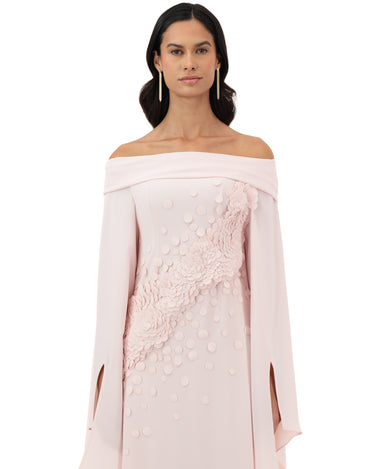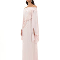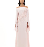 Blush Pink Off-Shoulder Gown With Flared Slit Sleeves, Featuring Floral Appliqué And Textured Dot Embellishments Across The Bodice