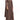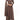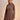 A rich brown dress with a high neckline, featuring intricate bead embellishments in a curving pattern across the chest. The design includes a flowing cape detail on one sleeve, adding a sophisticated and modern touch.