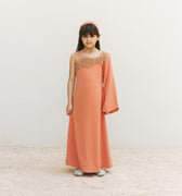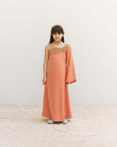 Peach One-Shoulder Gown Featuring Textured Embellishment At The Neckline And A Single Long Sleeve