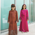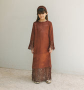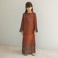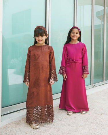 Rust-Colored High-Neck Dress Featuring Subtle Textured Fabric, With Netted Mesh Detailing On The Sleeves and Hem