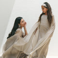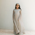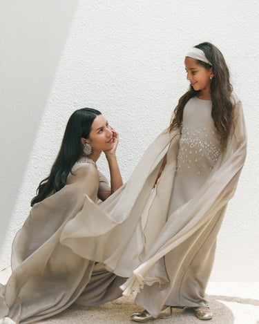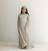 A Crepe Gown With Organza Cape Sleeves, Finished With Delicate Crystal Embellishments